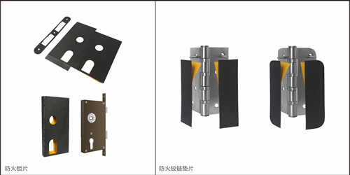 防火鉸鏈墊片:襯墊于防火門(mén)鉸鏈的后面,連接由于安裝鉸鏈而切斷的防火密封條,防止火災(zāi)中熱氣和火焰 通過(guò)此薄弱環(huán)節(jié),導(dǎo)致防火門(mén)的完整性喪失