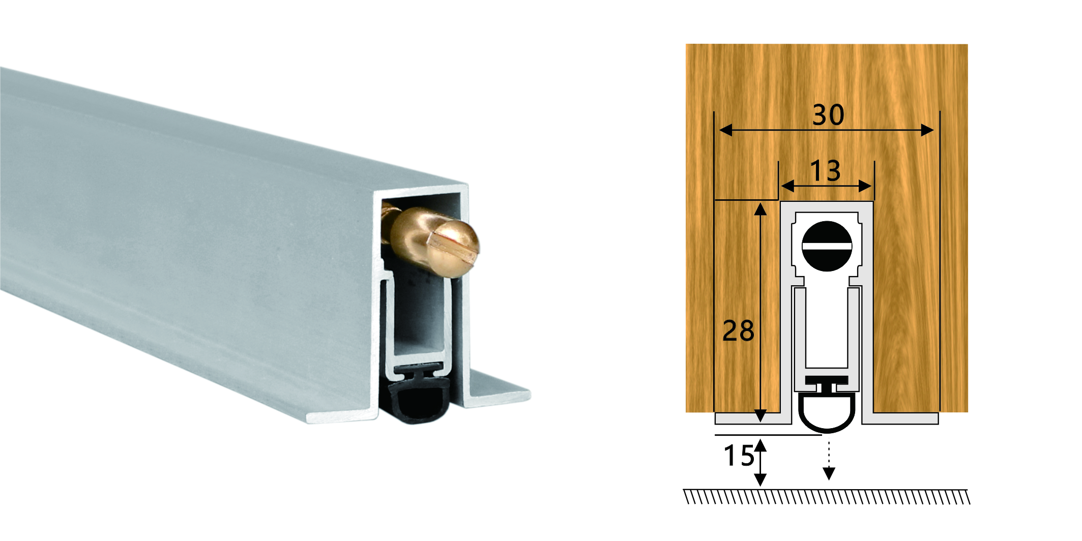 嵌入式門底自動(dòng)升降式密封器,四連桿機(jī)構(gòu),適用于門扇內(nèi)開(kāi)槽的門。安裝時(shí)需在門底有一個(gè)28mm*13mm的通槽,將產(chǎn)品放置其中,將兩端蓋板和密封器用螺 絲固定(或用螺絲從密封條底部向上固定),使用本產(chǎn)品不影響門的整體風(fēng)格。