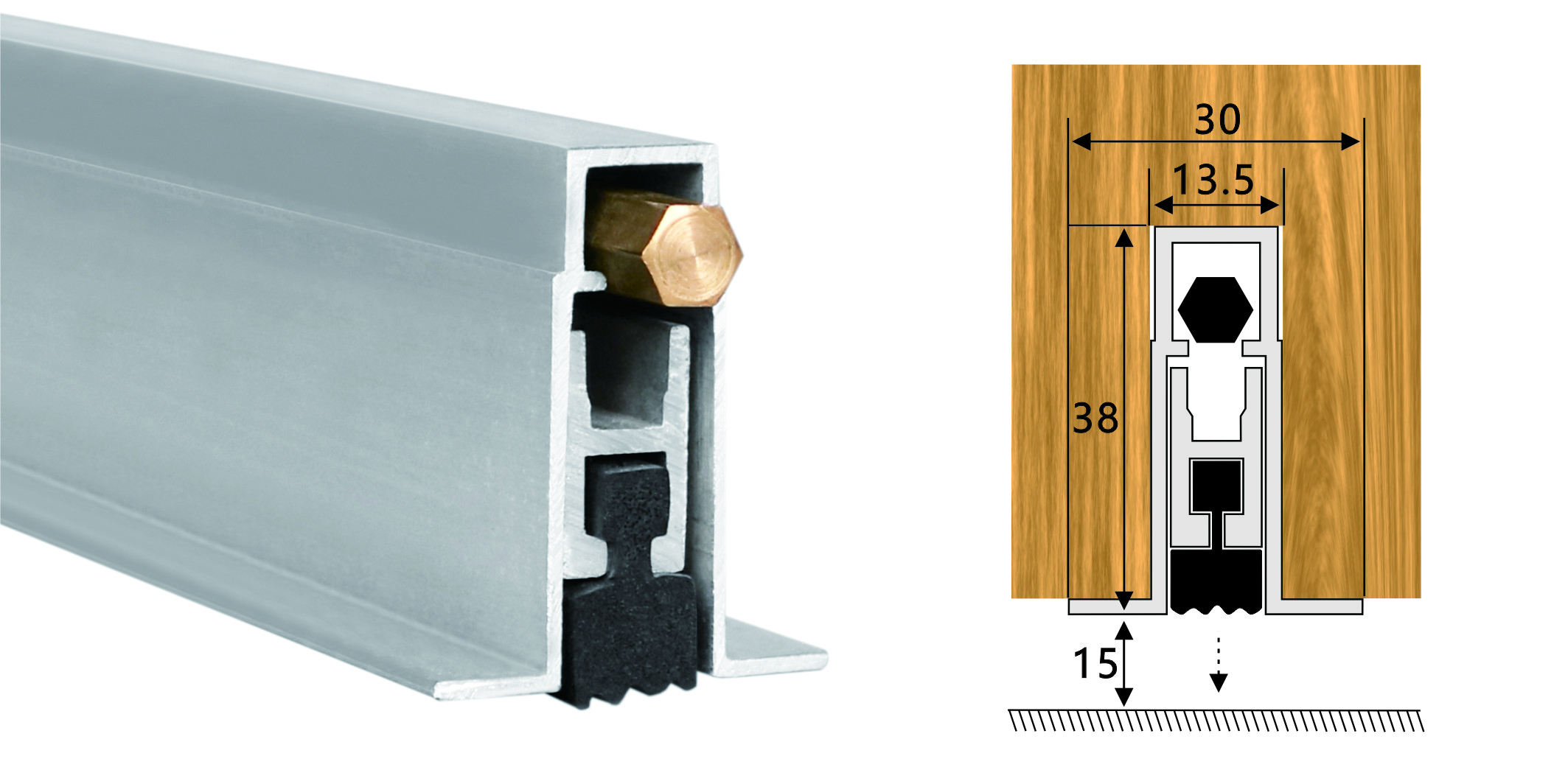 嵌入式門底自動升降式密封器,M型彈簧結構,適用于門扇內開槽的門。安裝時需在門底有一個38mm*13.5mm的通槽,將產品放置其中,從產品的翼上固定,并將裝飾端蓋板用螺絲裝上,使用本產品不影響門的整體風格。