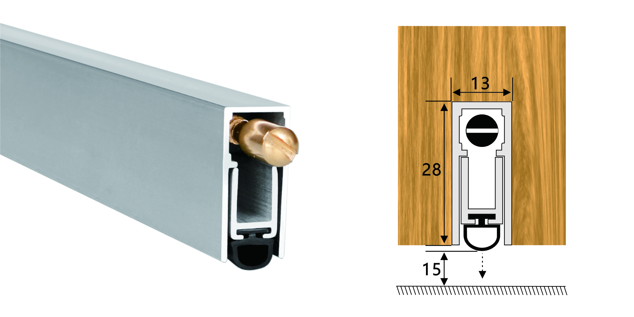 嵌入式門底自動升降式密封器,四連桿機構,適用于門扇內(nèi)開槽的門。安裝時需在門底有一個28mm*13mm的通槽,將產(chǎn)品放置其中,將兩端蓋板和密封器用螺絲固定(或用螺絲從密封條底部向上固定),使用本產(chǎn)品不影響門的整體風格。