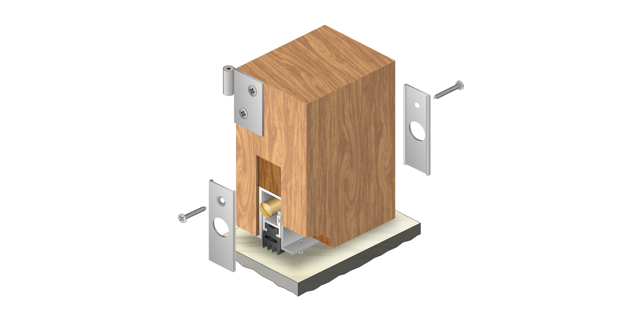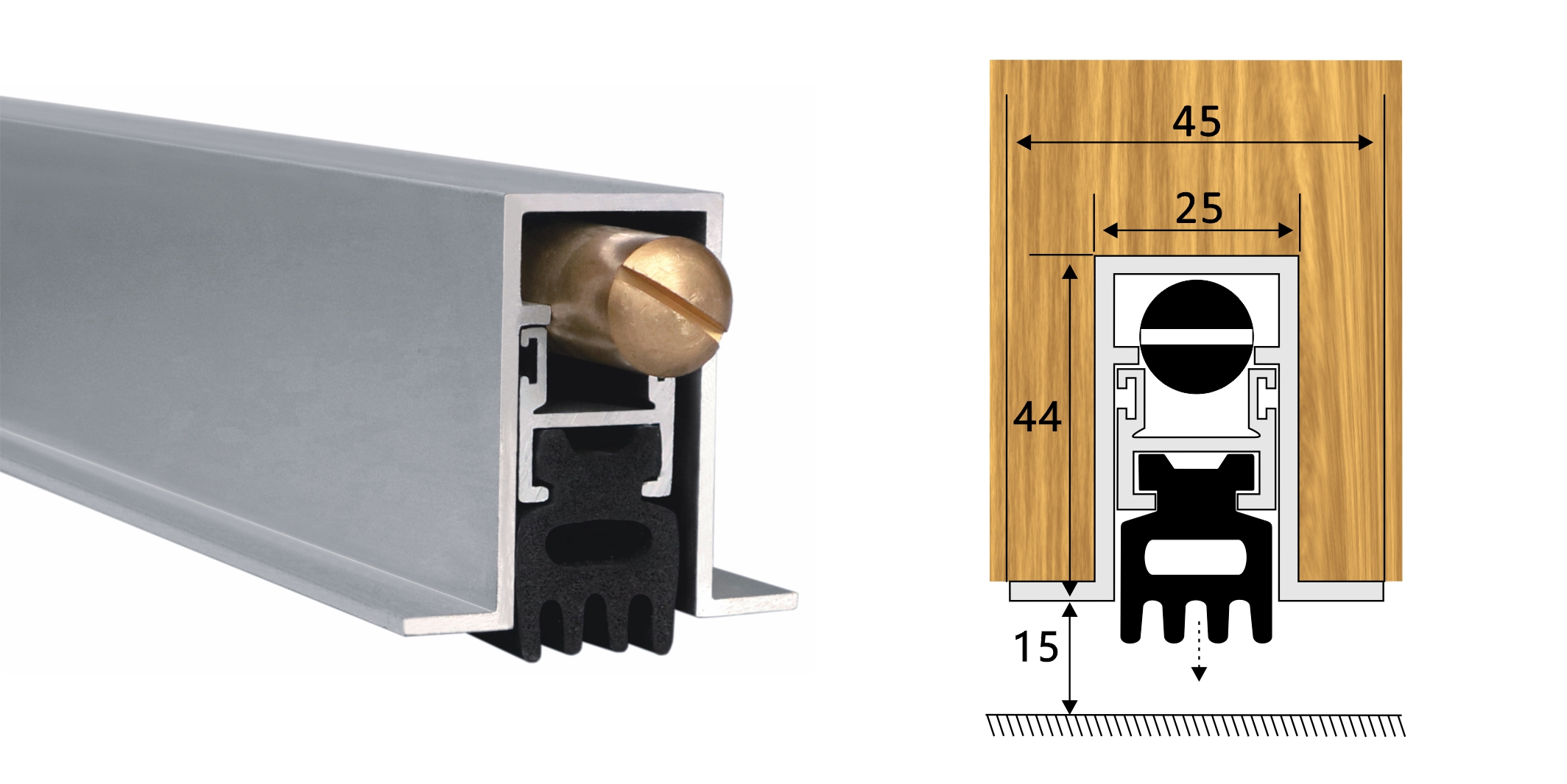 為重型門而設(shè)計,門的厚度要大于45mm,多用于工礦企業(yè)對隔音要求高的門。安裝時需在門底加工一條44mm*25mm的通槽,將產(chǎn)品放置其中,從產(chǎn)品的翼上固定,并將裝飾端蓋板用螺絲裝上,使用本產(chǎn)品不影響門的整體風格。