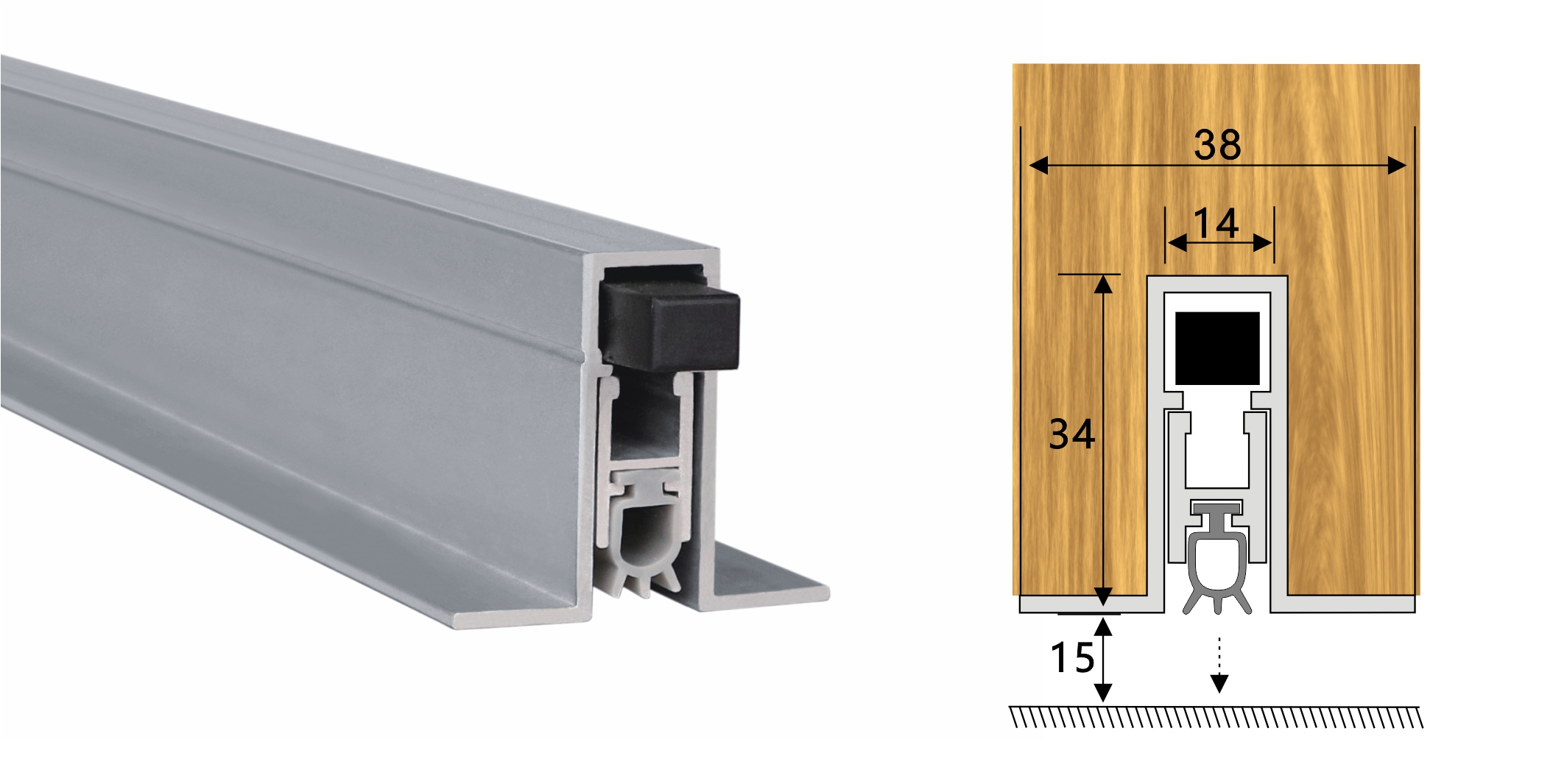 嵌入式門底自動(dòng)升降式密封器,M型彈簧結(jié)構(gòu),適用于門扇內(nèi)開槽的門。安裝時(shí)需在門底有一個(gè)34mm*14mm的通槽,將產(chǎn)品放置其中,從產(chǎn)品的翼上固定,并將裝飾端蓋板用螺絲裝上,使用本產(chǎn)品不影響門的整體風(fēng)格。