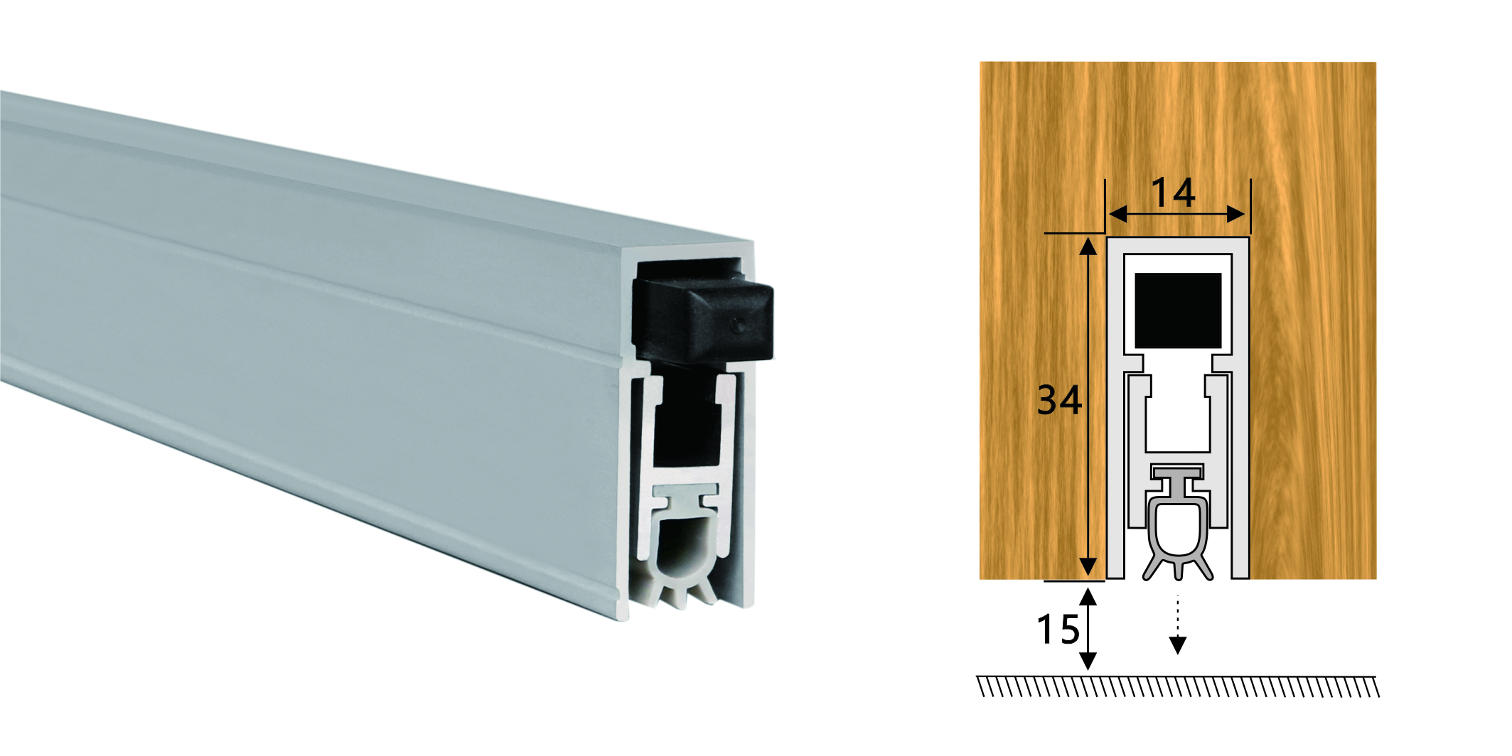 嵌入式門底自動(dòng)升降式密封器,M型彈簧結(jié)構(gòu),適用于門扇內(nèi)開槽的門。安裝時(shí)需在門底有一個(gè)34mm*14mm的通槽,將產(chǎn)品放置其中,將兩端蓋板和密封器用螺絲固定,使用本產(chǎn)品不影響門的整體風(fēng)格。