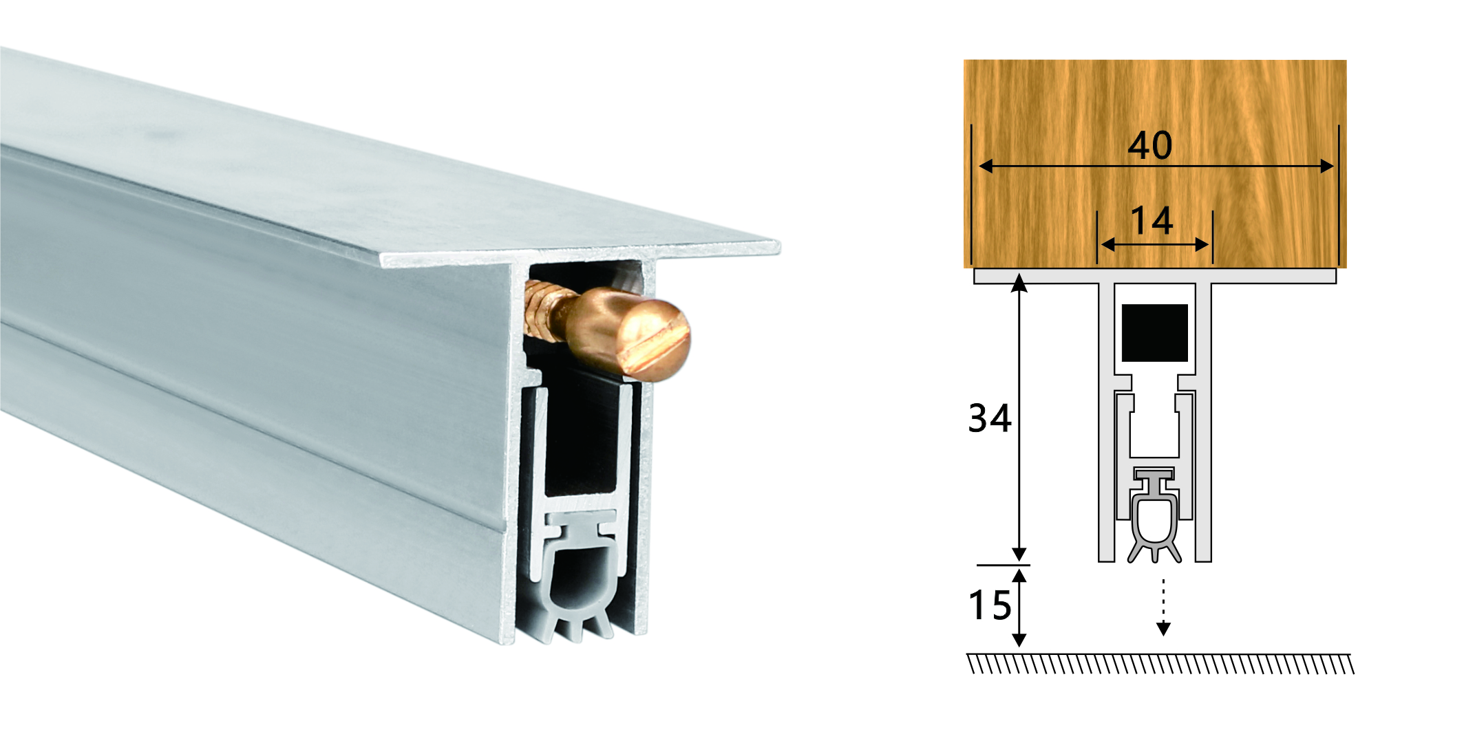 為省去門底開槽的工作,特別設(shè)計(jì)了B03的擴(kuò)展應(yīng)用的門底自動(dòng)升降式密封器。只需設(shè)計(jì)時(shí)將門的高度做短34~35毫米,將自動(dòng)門底條用螺絲從兩翼上直接固定,即可。其作用與B092一樣,密封條自動(dòng)上升,膠條與地面無摩擦。